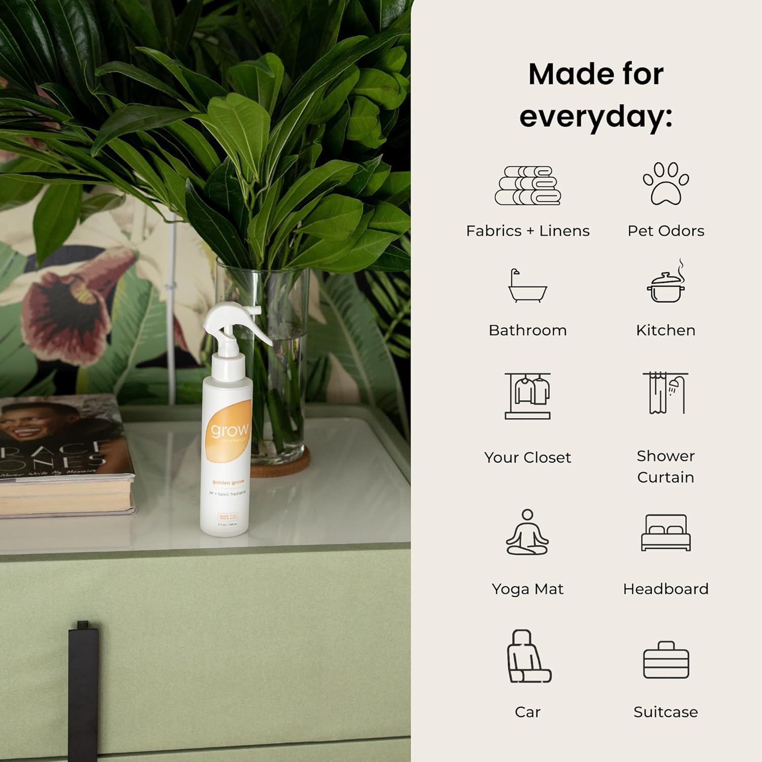 - Natural Essential Oils: Invigorate your home with Golden Grove air freshener spray, crafted with a blend of all-natural essential oils sourced from fresh plants, herbs, and botanicals like sweet citrus, tropical fruits, and watery green blends. Bring the uplifting aromas of nature into your home while avoiding harsh synthetic fragrances.