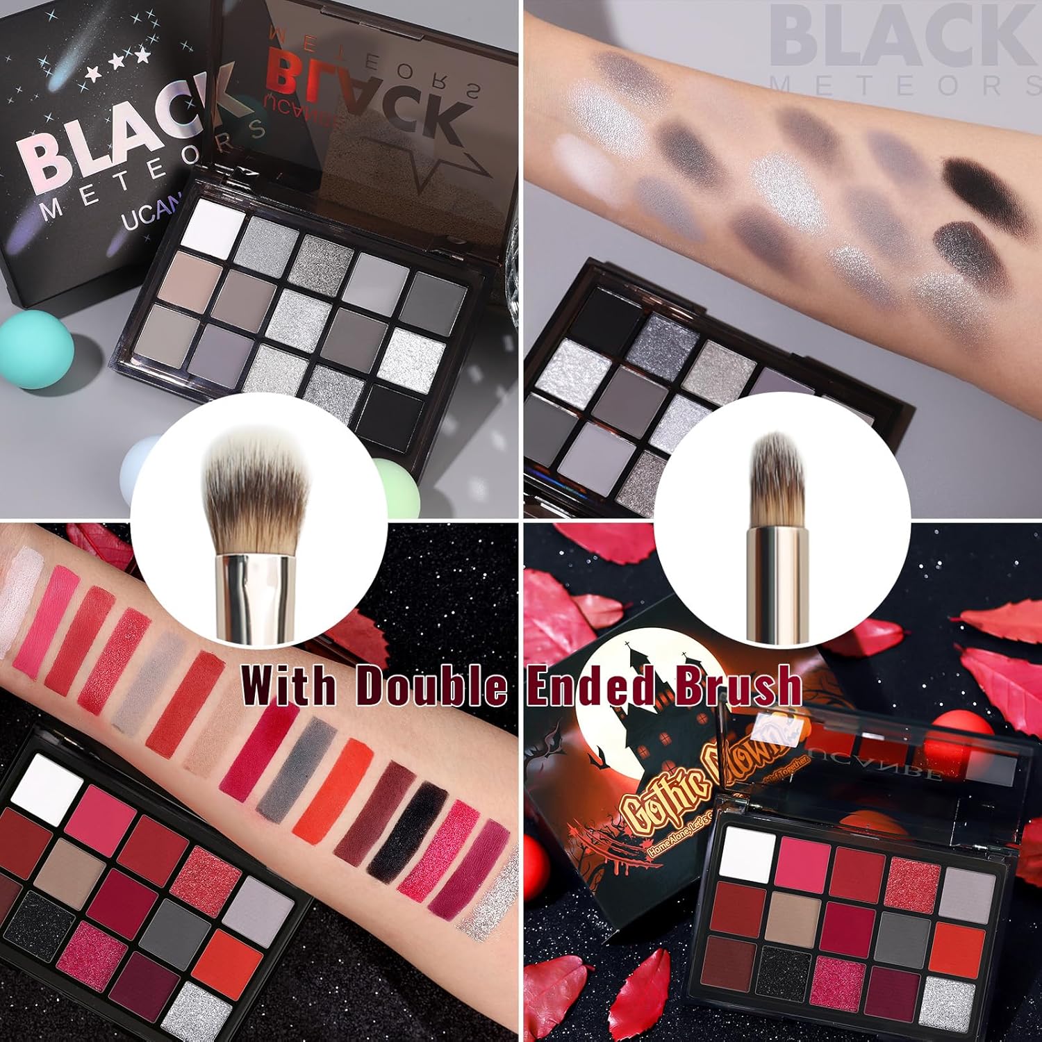 UCANBE 2pcs Halloween Eyeshadow Palette Makeup Set, Black Red Colors Shimmer Matte Metallic Smokey Dark Eye Shadow Pallet with Soft Brush Kit, Goth Eye Make Up for Costume Joker Clown Vampire