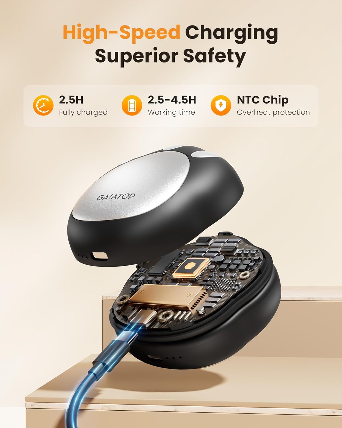 - Long Battery Life: The hand warmers rechargeable lasts for 2.5-4.5 h and fully charged within 2.5 h; Comes with 2 cables so they for charging at the same time; The LED lights are easy to read and tell you what heat level the portable hand warmer is on