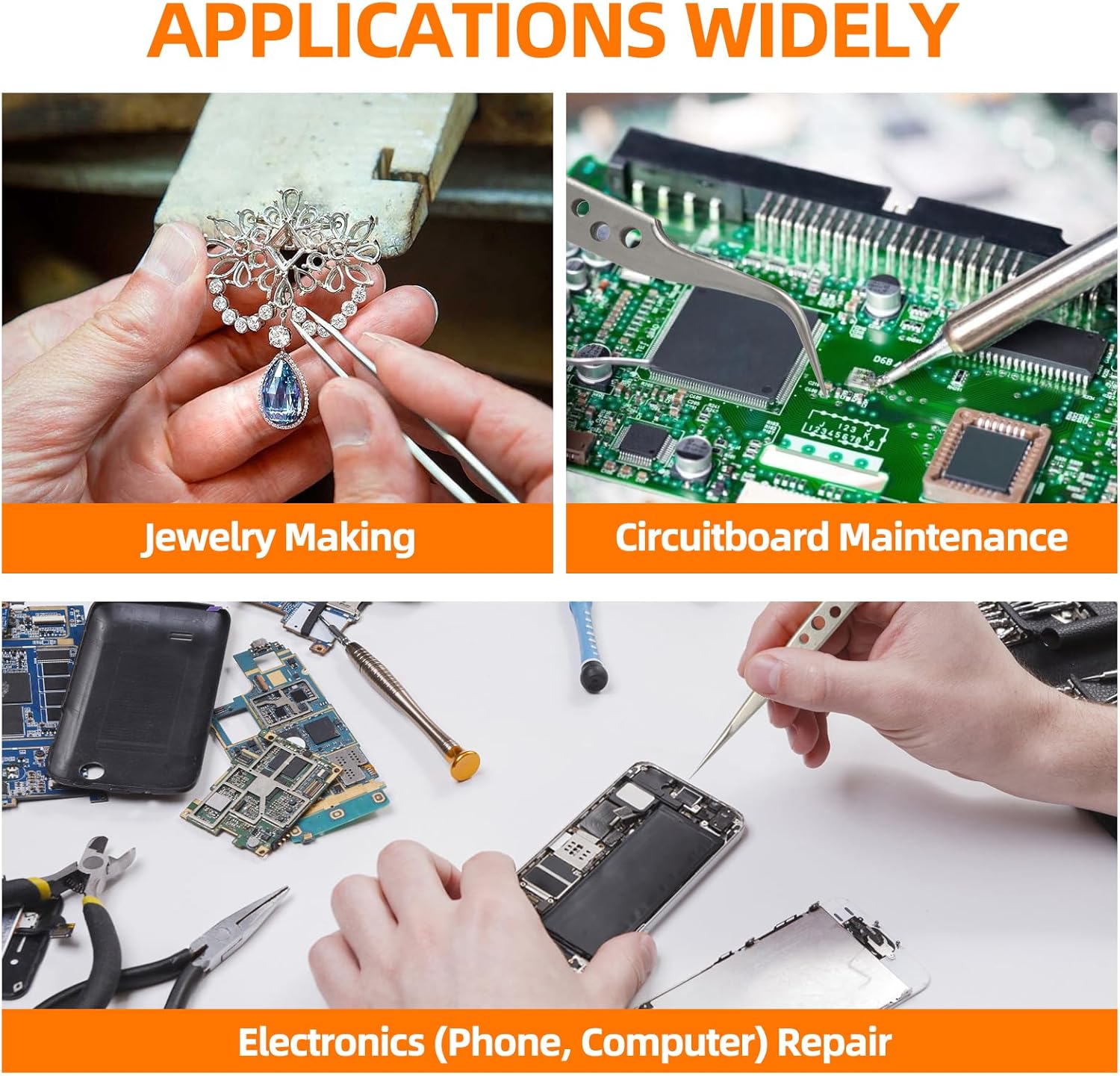 - β FEITA multifunctional tweezers set has 5 types of tweezers, which suit for Electronics Repair, Craft, Jewelry, Soldering, Lab work, Model making, Stamp or coin collecting, Weeding vinyl design, Ingrown hair removal, Eyelash extension, Eyebrow removal, Paper Sculptures, Embroidery, Phone repair, Watch repair, Cameo, Diamond Painting, eyeglass, apparatus, etc.