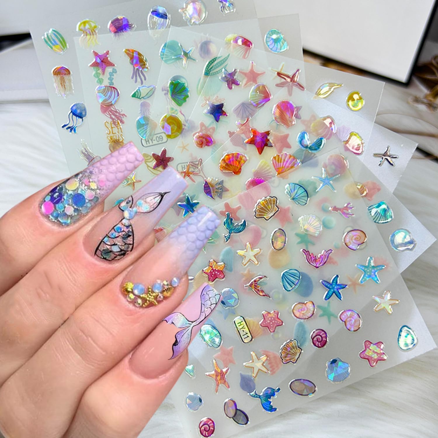 - Wide Occasions: Self-adhesive marine life nail design cute nail stickers are very suitable for decoration of your fingernails, not only for nail art decorations, 3d mermaid nail stickers are also for decoration of your mobile phone cases, greeting cards, body art, etc. Suitable for home use and professional nail salon.