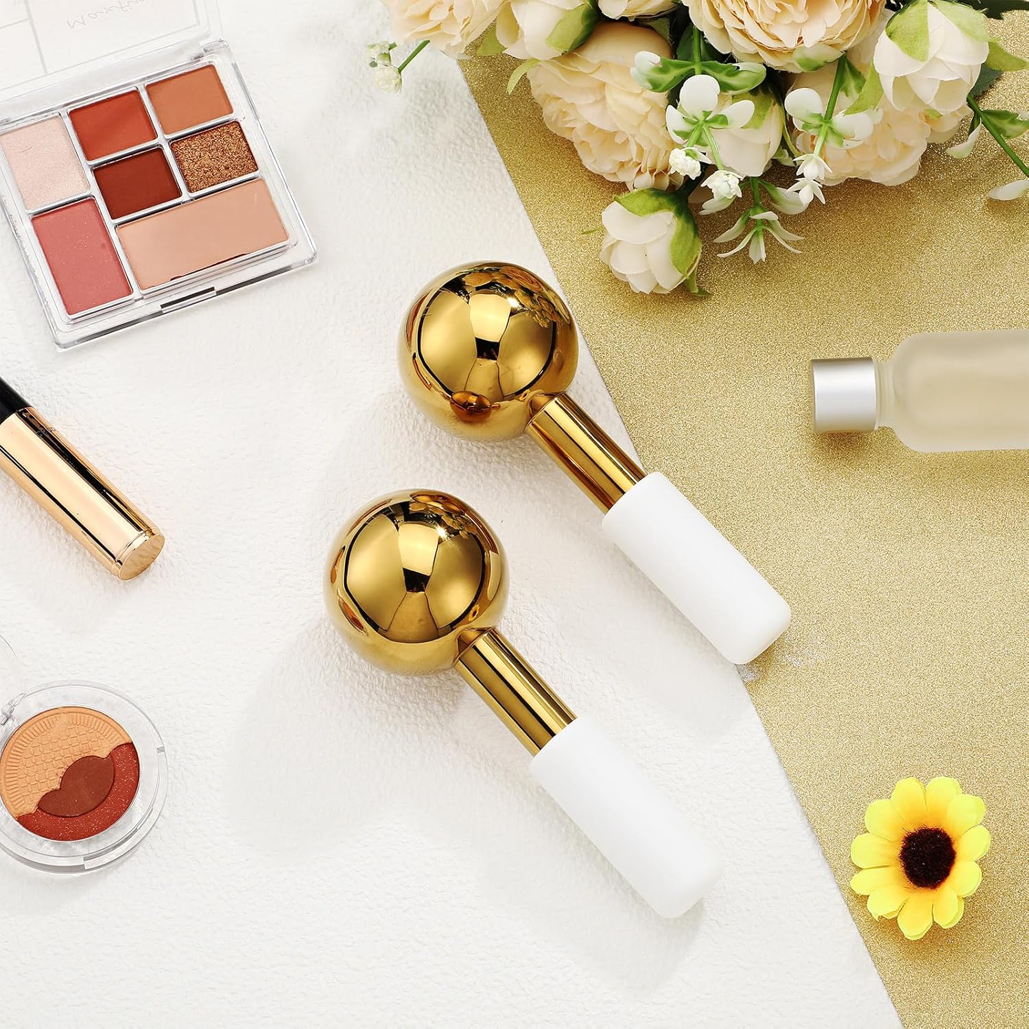 Baderke 2 Pcs Ice Globes for Face Stainless Steel Cooling Globes Unbreakable Cooling Roller Women Ice Balls Cryo Sticks Face Skin Care for Dark Circles, Puffiness(Gold (white Handle))