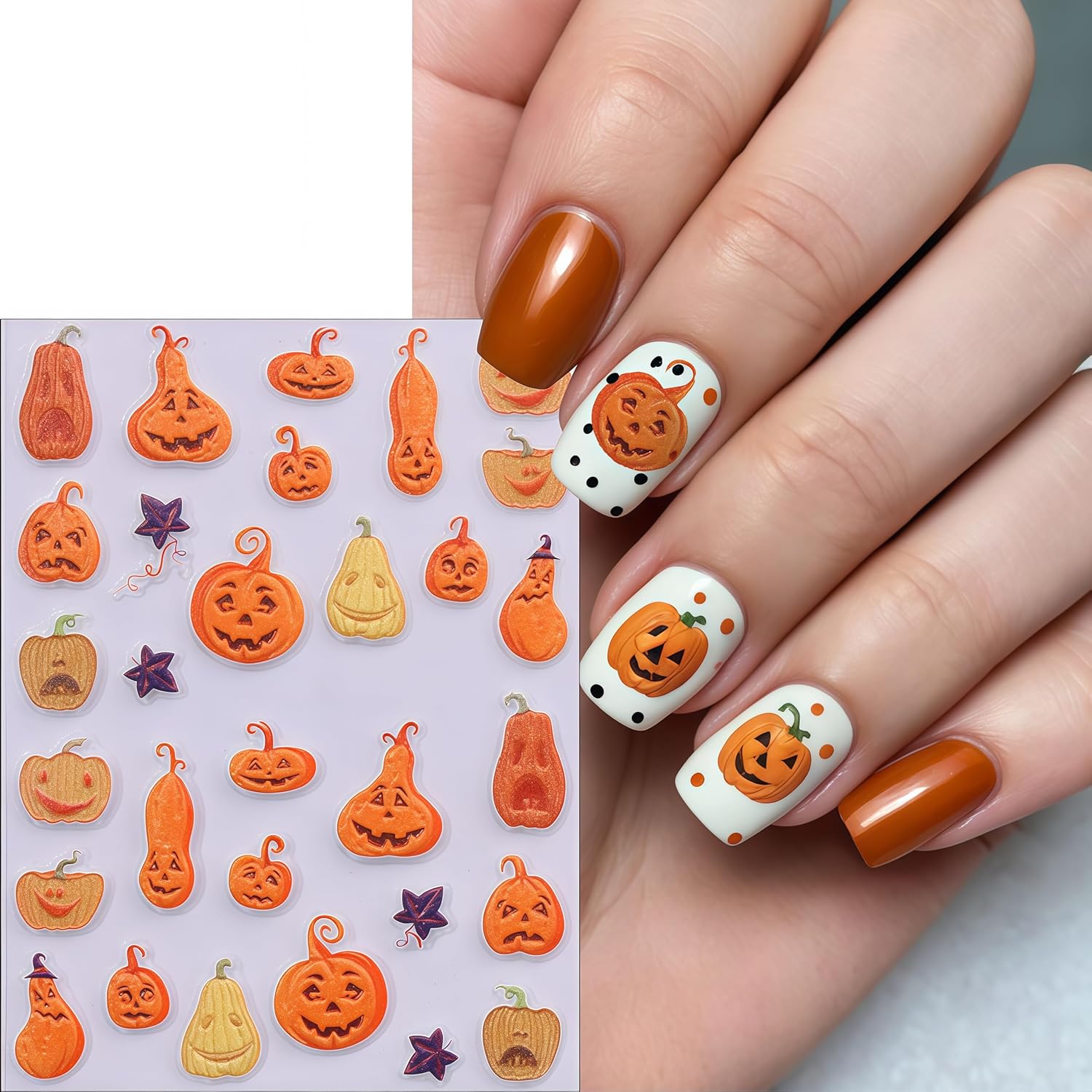 - Easy to Use: Cute pumpkin nail stickers decal are self-adhesive, completing fashion-cool nail art design in just a few seconds. If you want to keep it for a long time, you need to apply nail polish on the surface for reinforcement