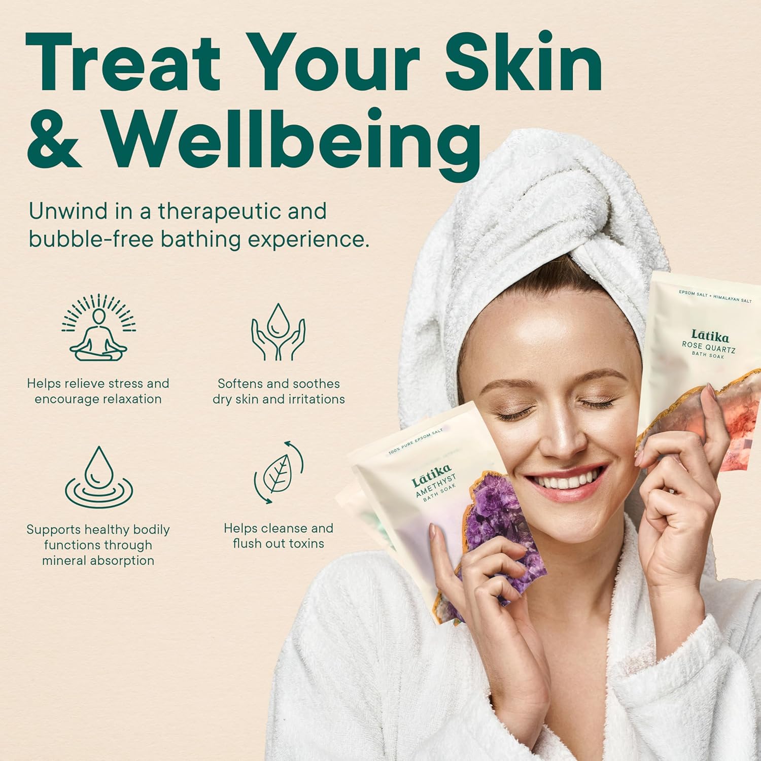 - STRESS RELIEF β Transform your bath into a sanctuary with our Geode-inspired Soak Set of 3, featuring Amethyst, Rose Quartz, and Emerald soaks infused with essential oils like lavender, sage, basil, sandalwood, and eucalyptus. This unique blend of Epsom salt and botanicals is crafted to promote calmness and melt away stress.