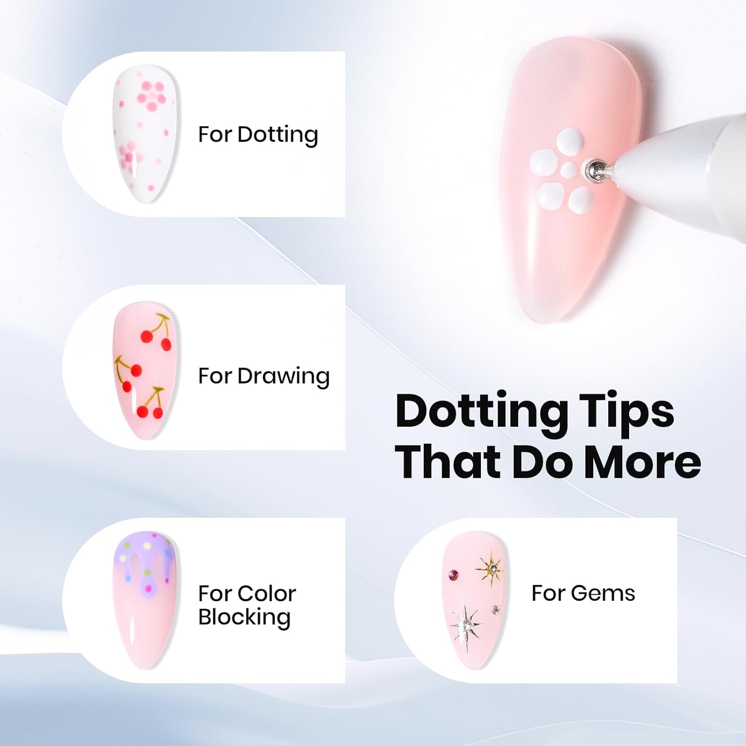 - Ergonomic Design for Effortless Artistry: Dotting tools nail art engineered with an adjustable switch for quick tip changes, a non-slip silicone grip, and an anti-roll body, the pen ensures hassle-free, precise control. Nail Dotting Tools perfect for all mani nail art design: Gel Polish, Acrylic Powder, Nail Extension Gel, Dip Powder, Press-on Nails, and False Nail Tips