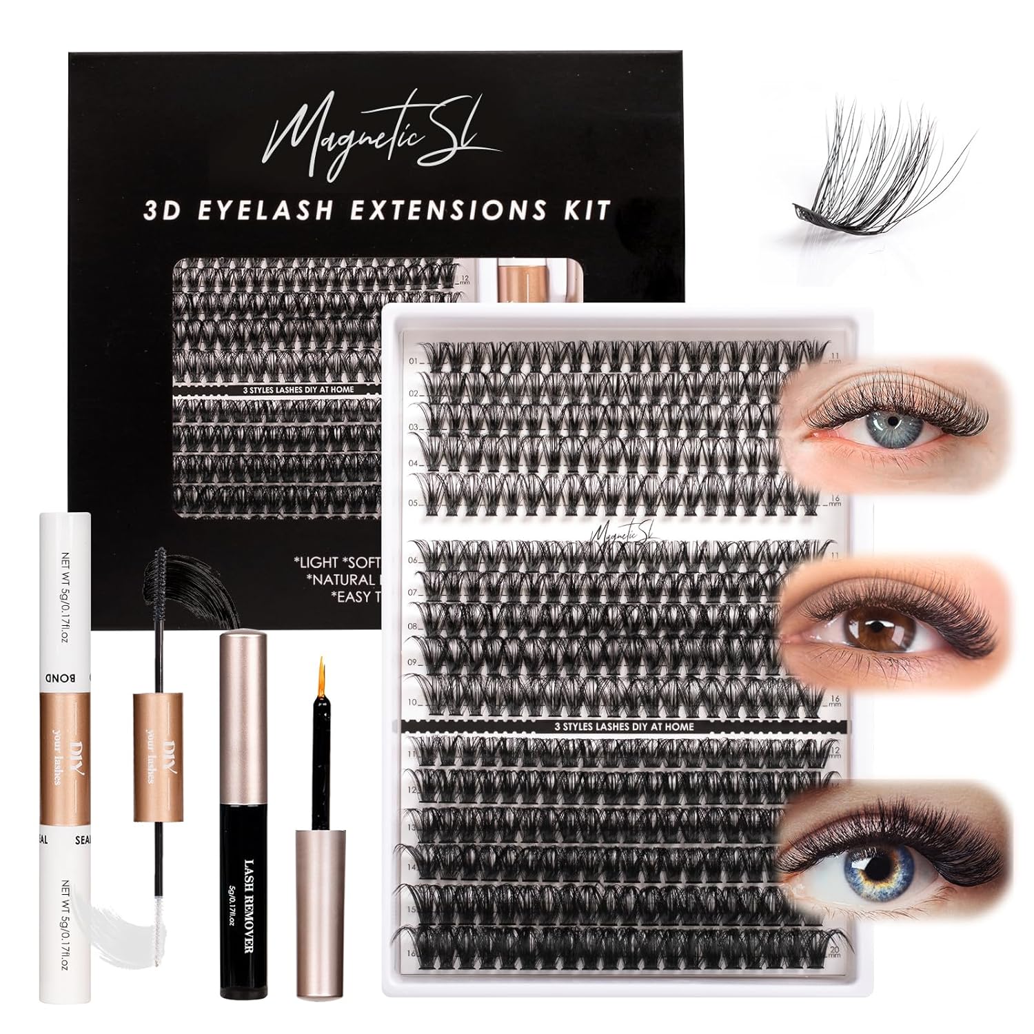 - You Will Get: Our eyelash extension kit allows you to create beautiful lashes at home. You'll receive our eyelash extension kit in each box, which provides 3 styles 320 cluster lashes, lash bond and seal, lash remover and a tweezers. It's a must-have tool for the everyday eyelash extension beginners or enthusiast, allowing you to customize your lashes to your liking, saving you time and money.