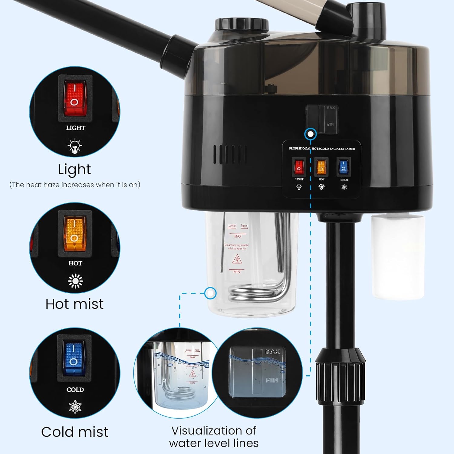 Professional Facial Steamer, 2 in 1 Hot&Cold Mist Facial Steamer, Facial Humidifier on Wheels, Esthetician Steamer for Facial Deep Cleaning and Moisturize, Suitable for Spa, Salon and at Home Use