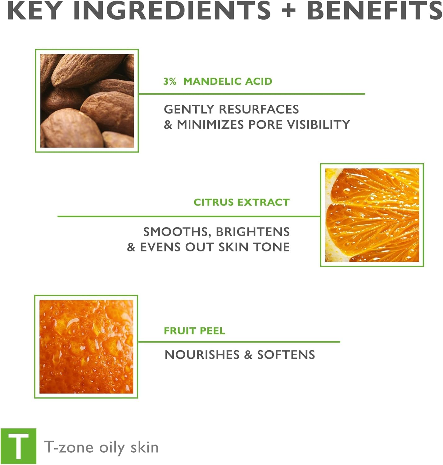 - EXFOLIATES & BRIGHTENS โ Mandelic acid clears dead cells and unclogs pores, while citrus extract and fruit peel fade discolorations. Leaves skin smoother, softer, and more radiant without causing dryness.