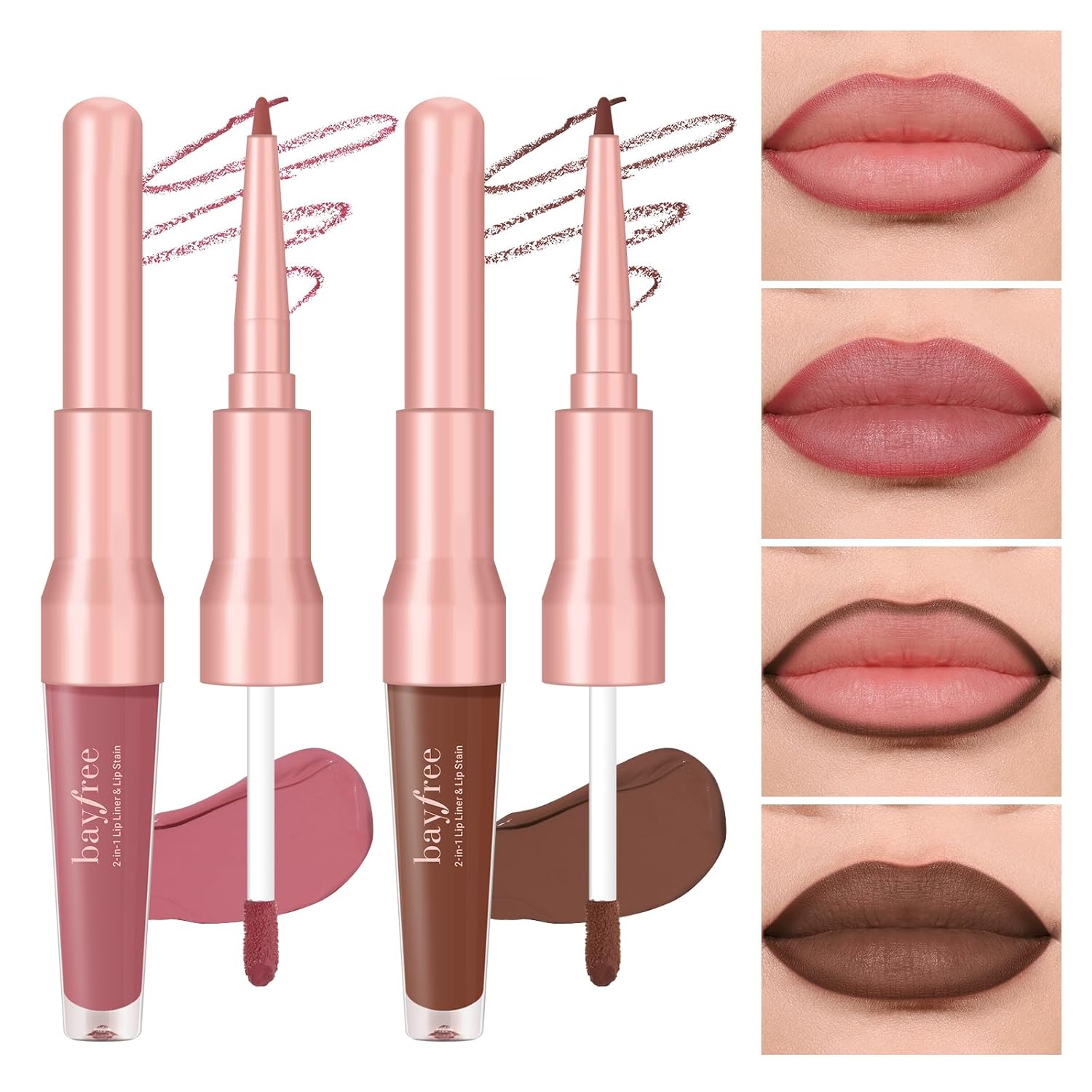 2 PCS Lip Liner and Lip Stain Combo Set, High Pigmented Long Lasting Velvet Lip Tint, Well-Defined Lipliner, Weightless Waterproof Not Animal Tested, Matte Finish Makeup