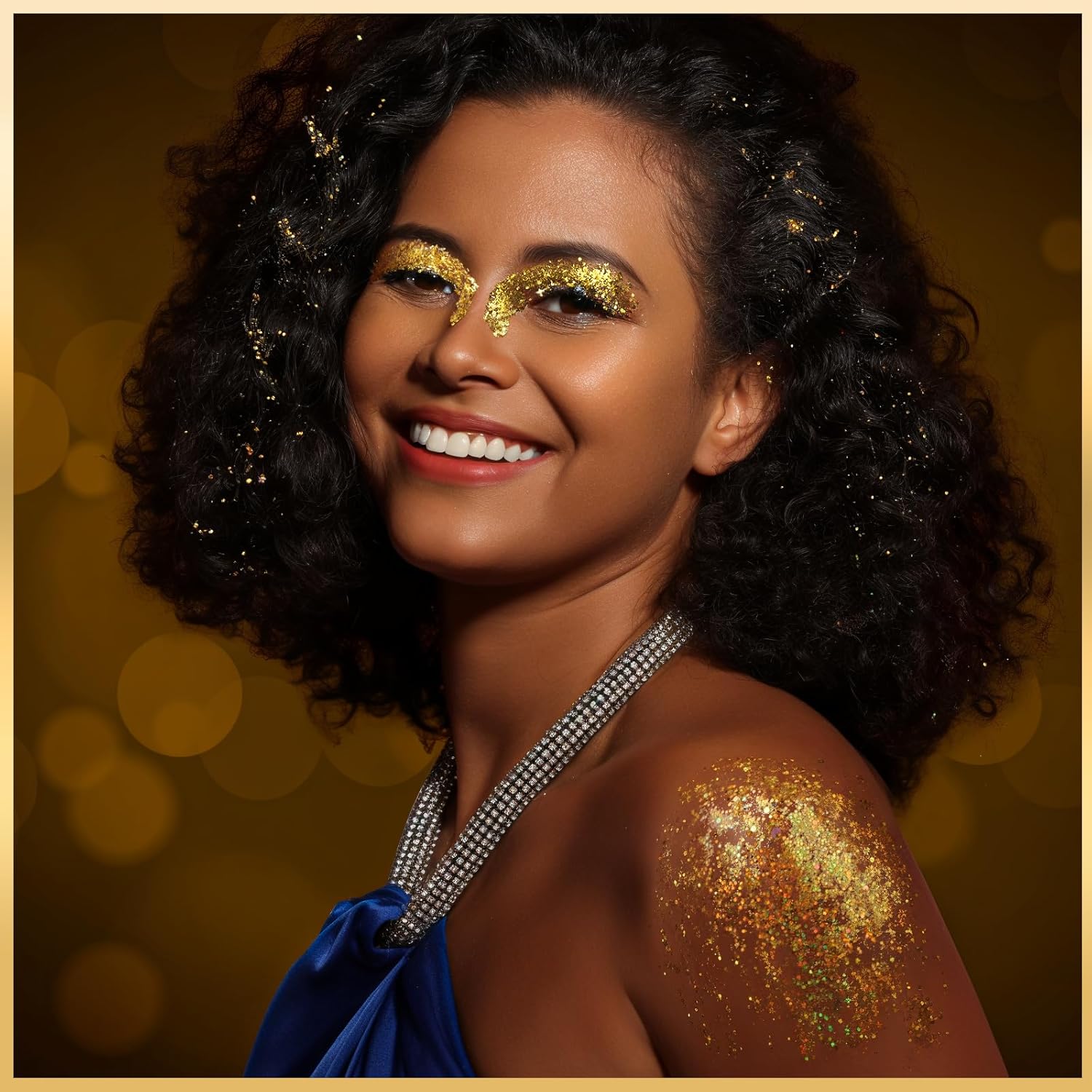 - GOLD GLITTER FOR FACE - Each glitter is securely stored in a compact container, ensuring easy storage and maintaining its freshness. The iridescent hues and vibrant gold are breathtakingly beautiful, making this set perfect for crafting festival-inspired looks for children of all ages. Plus, the handy jars fit seamlessly in your bag for on-the-go shimmer