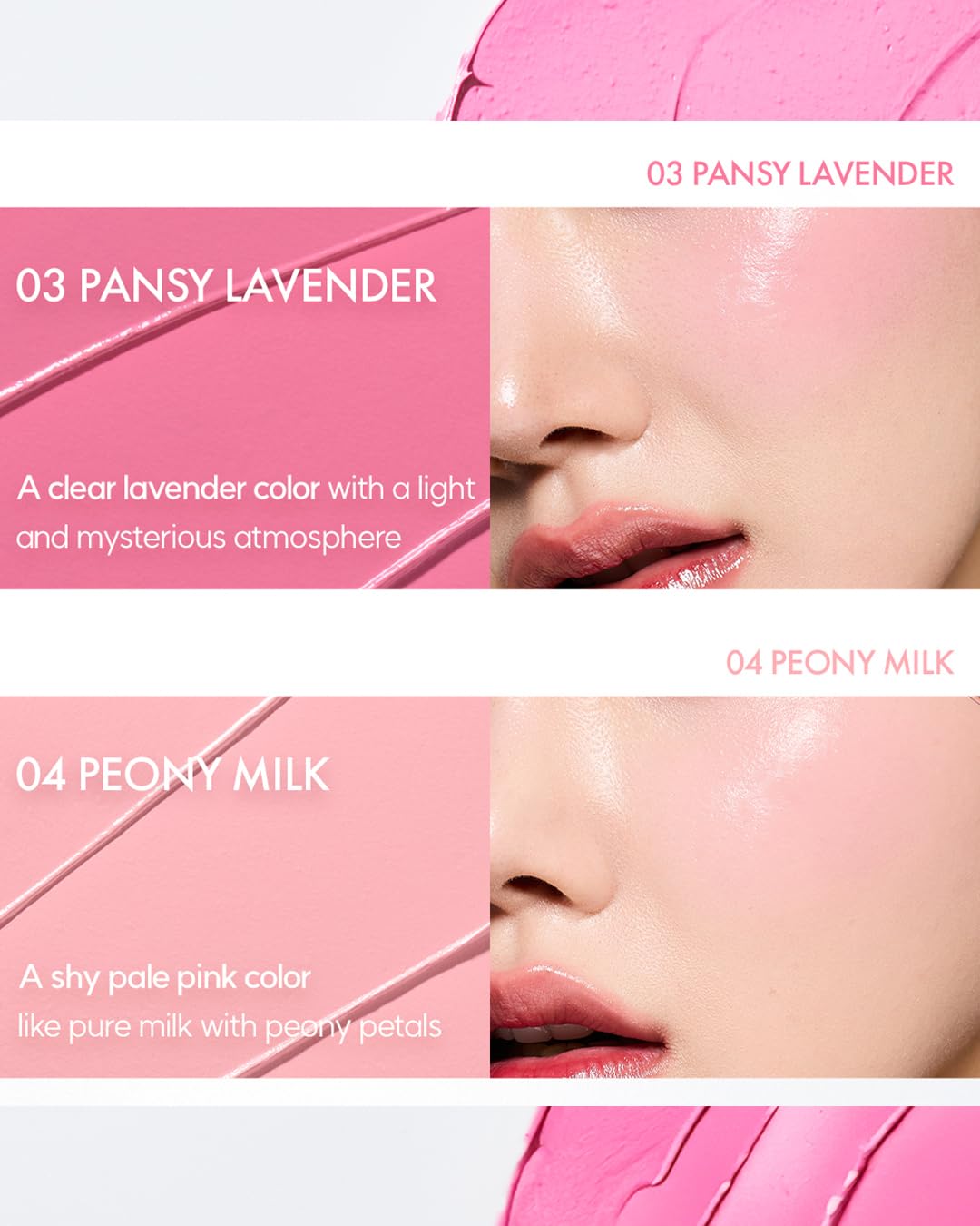 - PEONY MILK: Like pure milk mixed with peony petals, this shy pink color cream blush brings a delicate flush to your cheeks. Its gentle hue is suitable for all skin tones, offering a naturally soft, milky pink that enhances your complexion with a romantic and youthful glow.