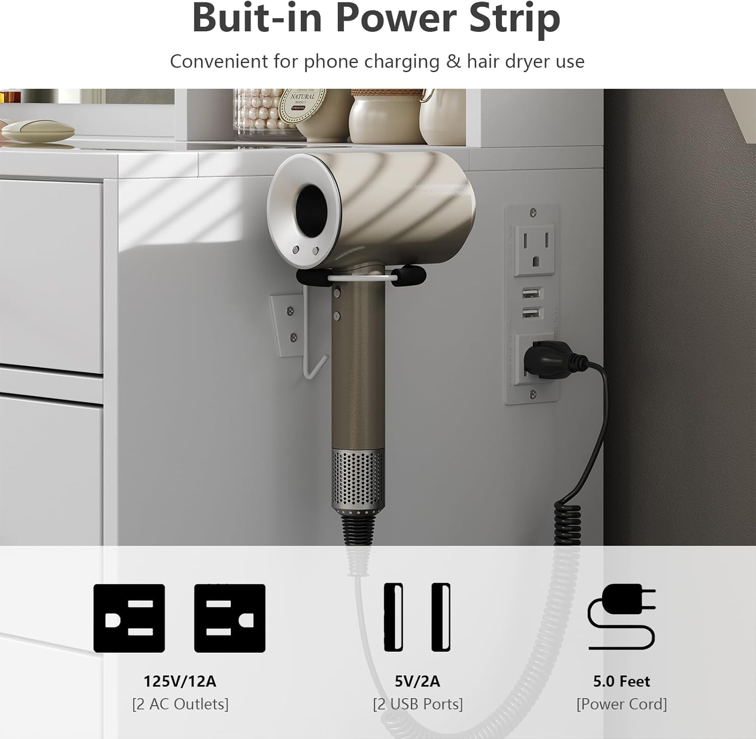 - Vanity Table with Charging Station: This Vanity comes with a hair dryer stand and charging station, including 2 standard plug sockets and 2 USB ports to connect your hair dryer, curling iron, computer, Ipad, mobile phone, allowing you to take beautiful selfies after applying makeup