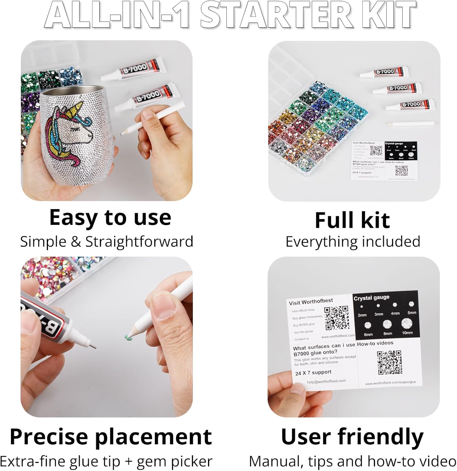 - Easy to Use -- This kit is designed to be straightforward, and versatile for various crafting projects. The manual is user-friendly and beneficial for both novice and experienced crafters. The complete and durable tools are suitable for precisely applying rhinestones to create intricate designs, with no additional tools required. Rhinestones are easy to apply and remove. The sturdy container with 24 grids keeps all rhinestones organized by size and color, making them easy to store and access