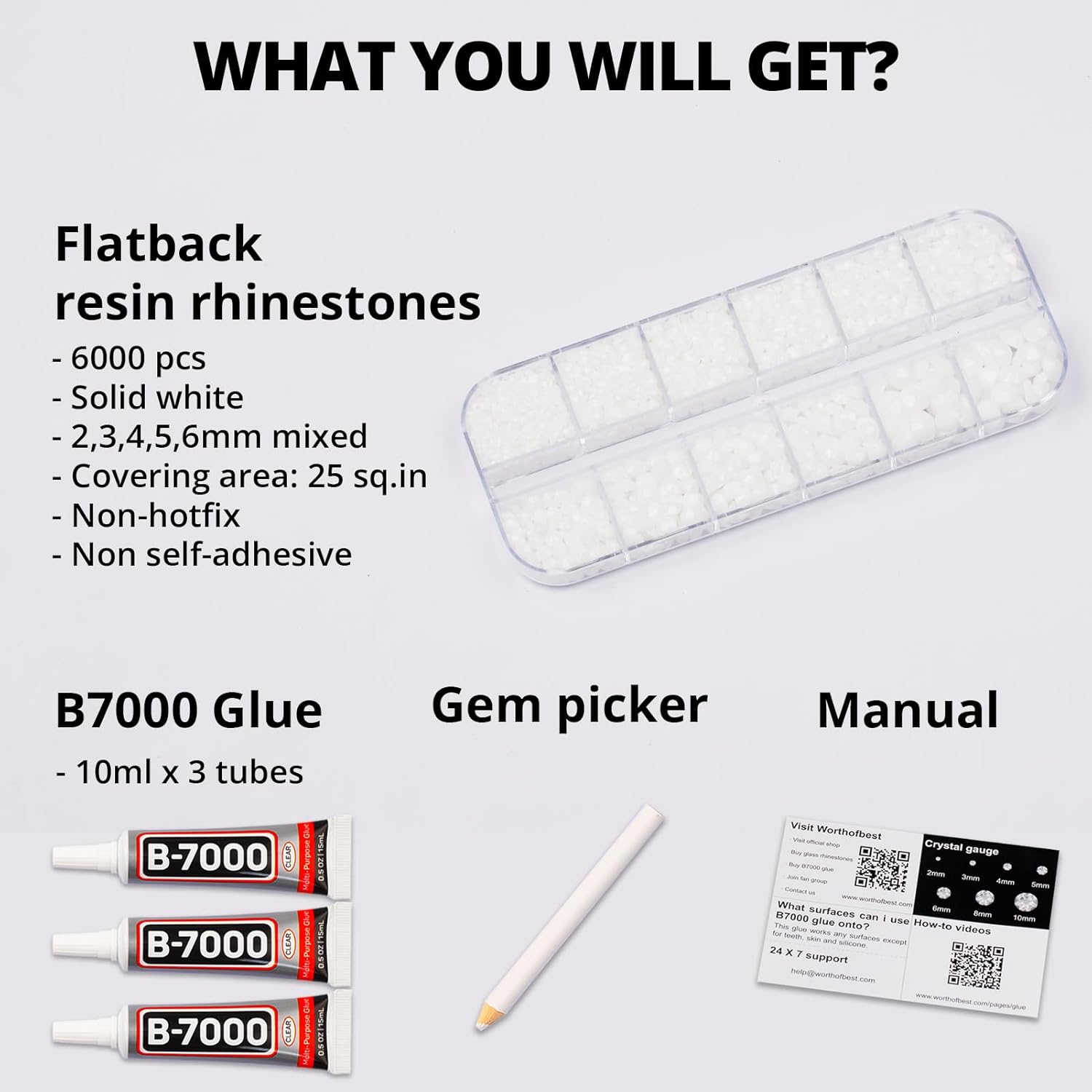 6000Pcs Solid White Rhinestones for Crafting Bedazzling with b7000 Glue, Bling Resin Flatback Crystals Diamonds for Crafts Clothing Tumblers Shoes Fabric Canvas, Flat Back Gems Mix 2-6mm