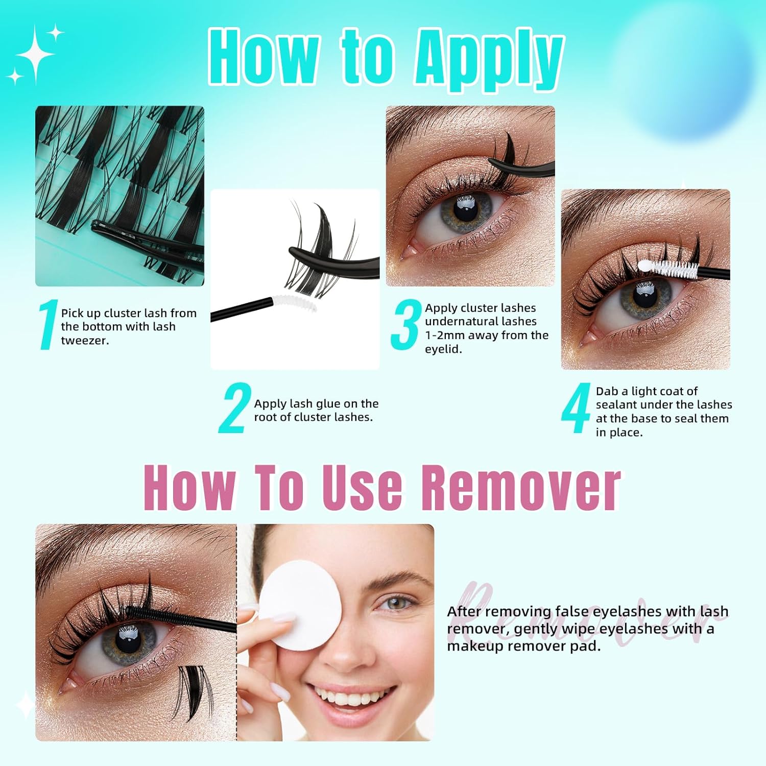 - HOW TO USE: First, curl your natural eyelashes. Next, gently brush your own eyelash with lash glue,then use tweezers to pick up the fairy lashes from the root. Then place the fairy lashes 2-3 mm away from the eyelid. Finally, apply eyelash seal from the bottom of the lashes from the bottom up. And repeat the above steps a few times, so you can finish your work!