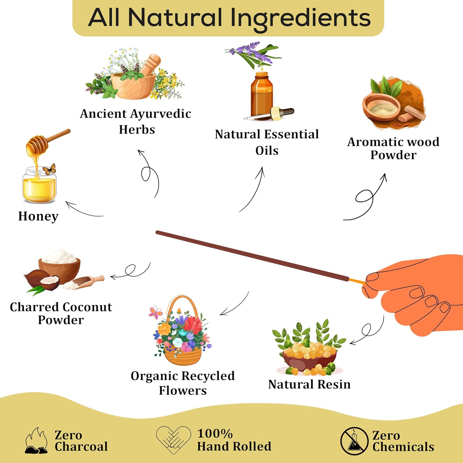 - 100% NATURAL Natural incense Sticks completely handmade MADE FROM SCRATCH by blending natural resins, Herbs, Spices with aromatic wood powders, charred coconut powder fragrant oils and honey.No Dipping in Toxic Chemicals.