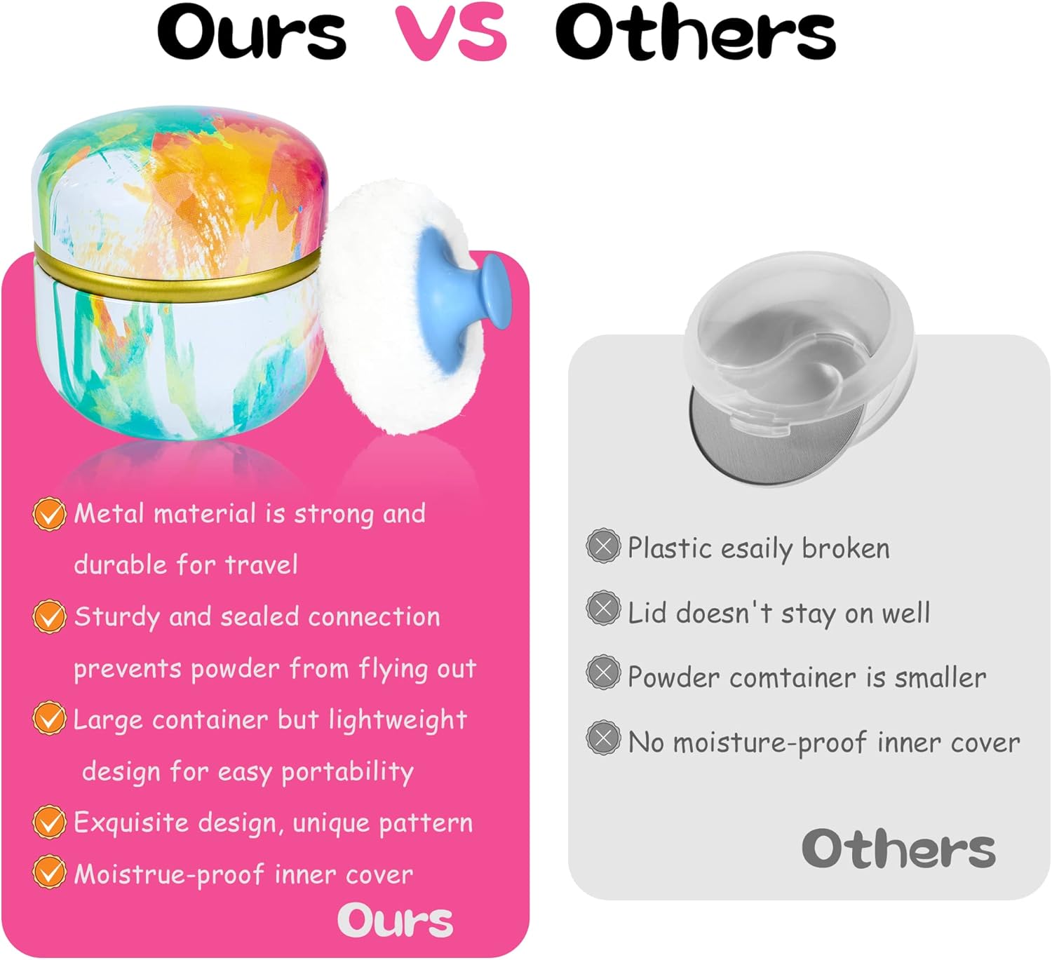 - Product contains a well-made powder case, a high quality powder puff with a handle and a small powder puff.