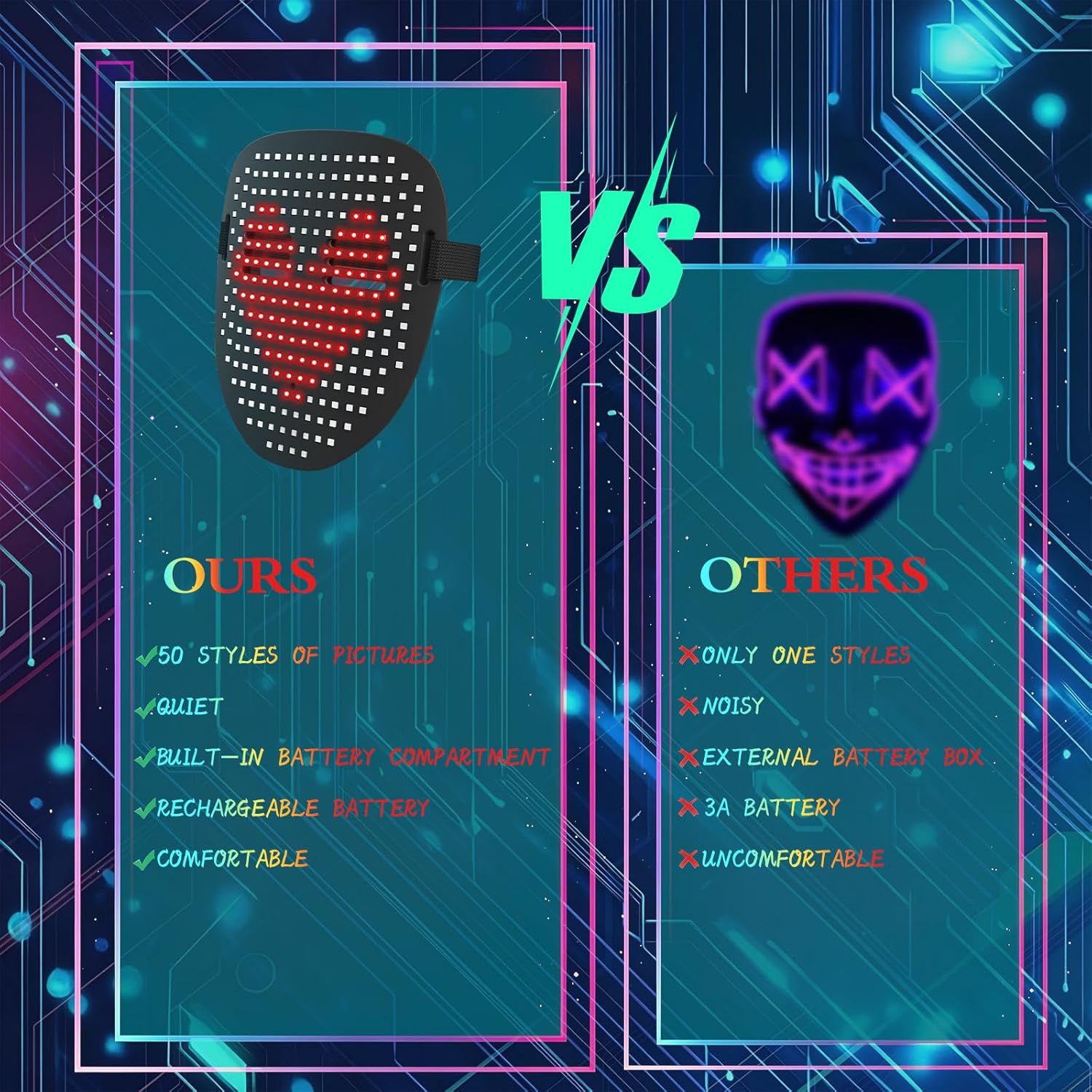 - [Safe and Durable Design]: Made from high-quality, non-toxic materials, this light up face mask is built to last. Itβs a safe and reliable choice for both adults and children, ensuring worry-free fun.