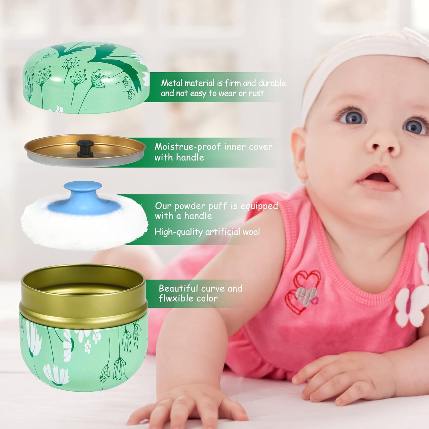 - The powder box has a delicate appearance and a variety of patterns for you to choose. The powder box is made of high-quality tinplate, which are not easy to break after being dropped, and not fade easily, and can be used for a long time. There is also a lid inside the powder box, so you don't have to worry about spilling powder.