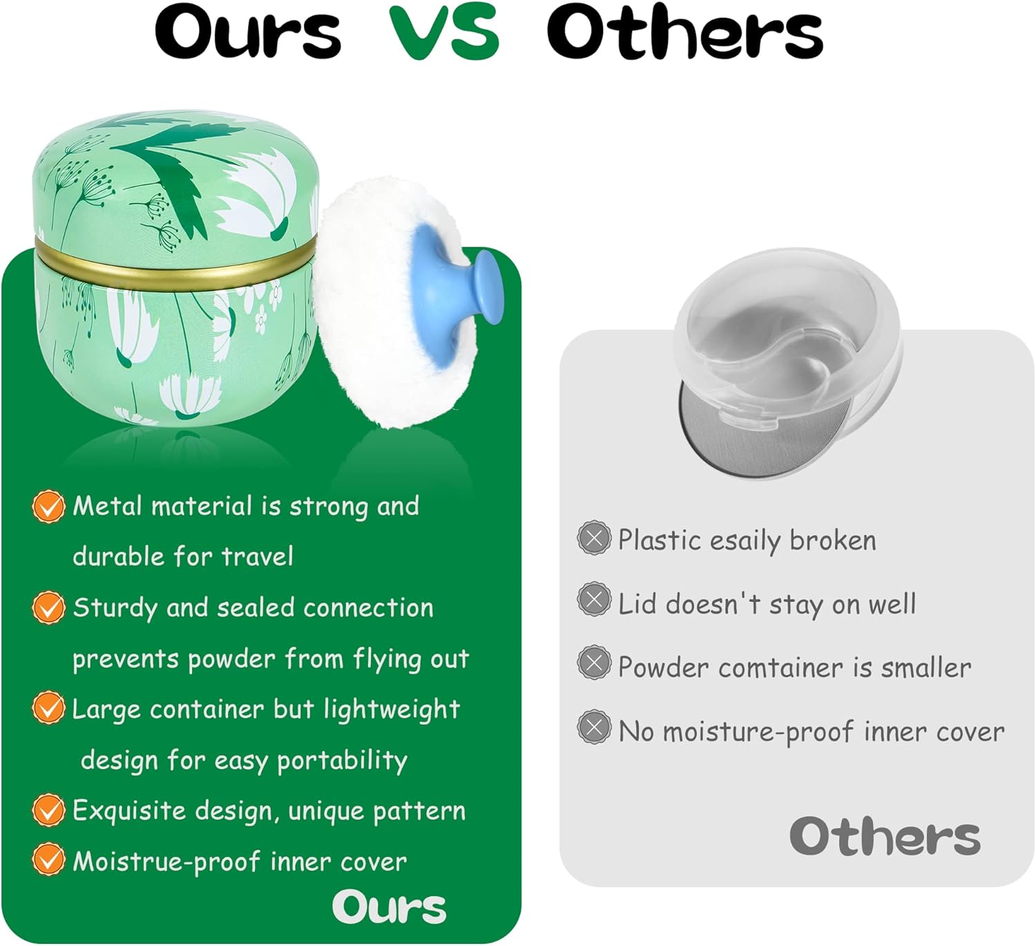 - Product contains a well-made powder case, a high quality powder puff with a handle and a small powder puff.