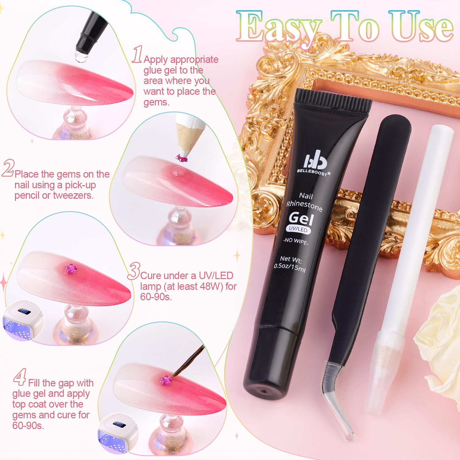 - Easy To Use -- These tools include tweezers and a pick-up pencil are designed to provide you with a simple and precise pick-up experience, can help you adjust the position of nail gems and create unique shapes, the glue is used to fix rhinestones