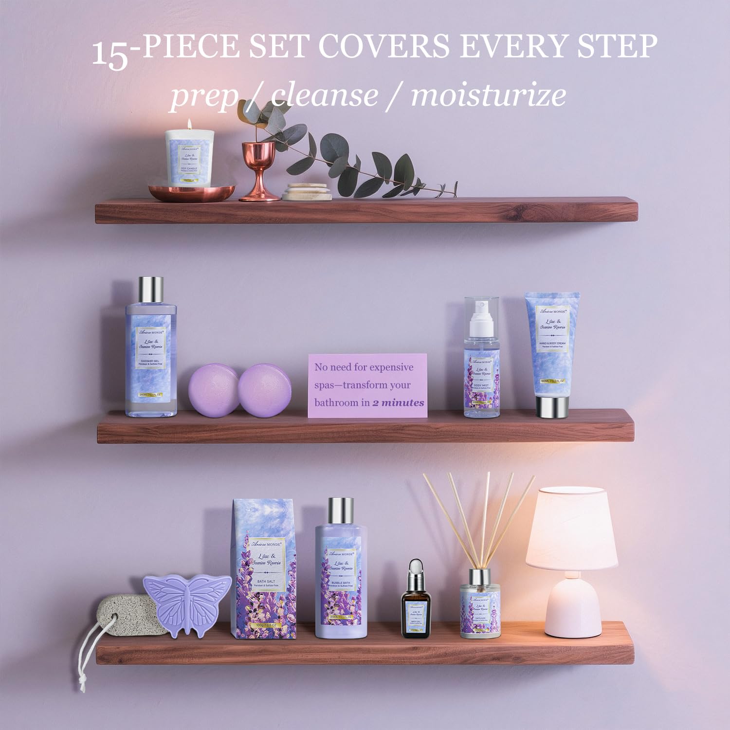 Gift baskets for women, 15Pcs Lilac Women Bath Gift Baskets w/Body Mist, Diffuser, Bath Bomb. Unique Relaxing Spa Gift Basket Set, Mothers Day Gifts for Mom Wife Grandma Daughter Friends Sister