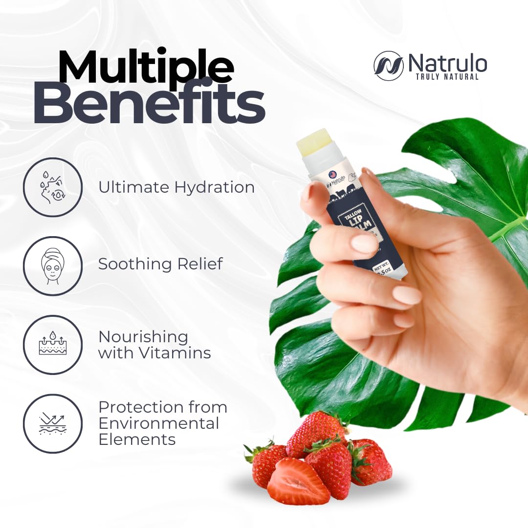 • INTENSELY HYDRATING FORMULA: Immerse your lips in moisture with our grass-fed organic beef tallow lip balm with strawberry flavor. Crafted with natural fats, akin to those in human skin, it maintains your lips' moisture barrier for enduring hydration and velvety softness.