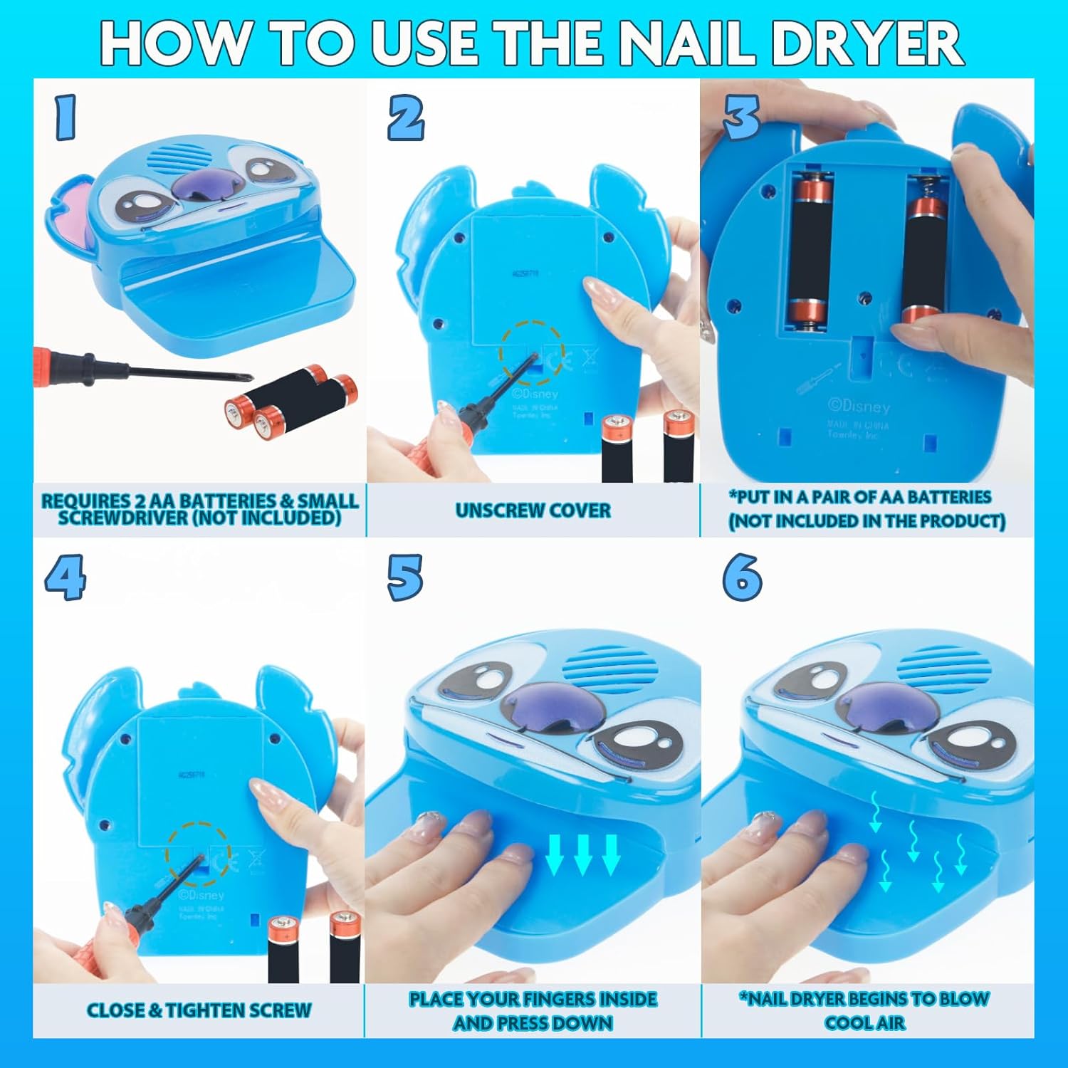 - SET INCLUDES: This set includes 16 different opaque and shimmery shades that includes different shades of purple, pink, green, red, blue, and more. Paired off with a Stitch-shaped, role-play nail dryer (batteries not included).