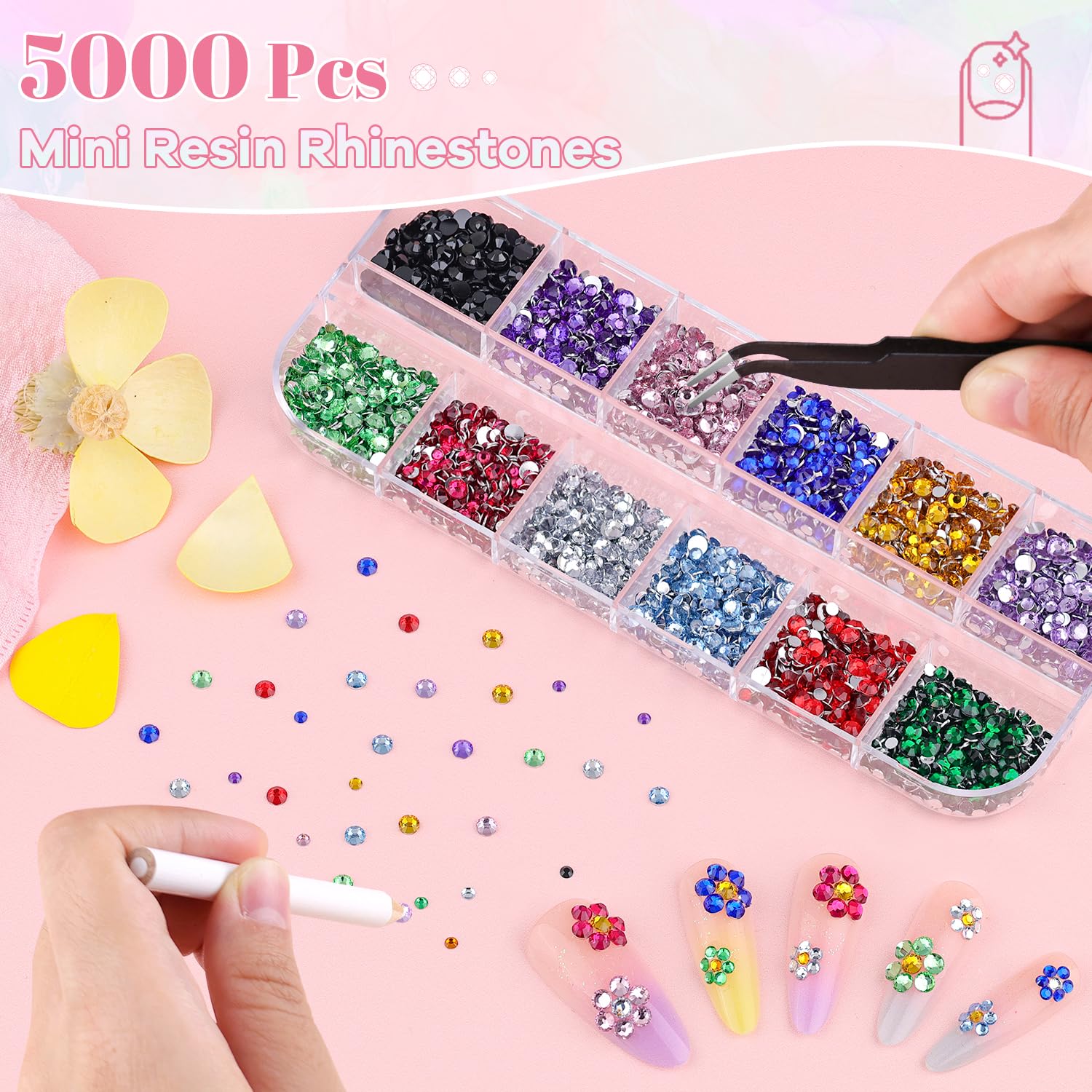 - Package Content -- One package includes approx. 5000 pcs (2/3 mm) Multicolors mini nail gems, 1 tweezers, 1 pick-up pencil and 15 ml rhinestone glue gel. The nail kit with sufficient tools can easily meet your nail design needs at home