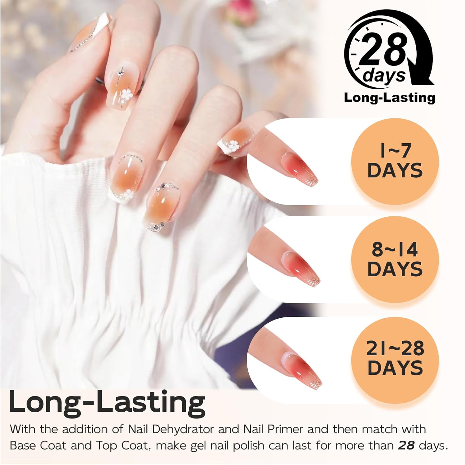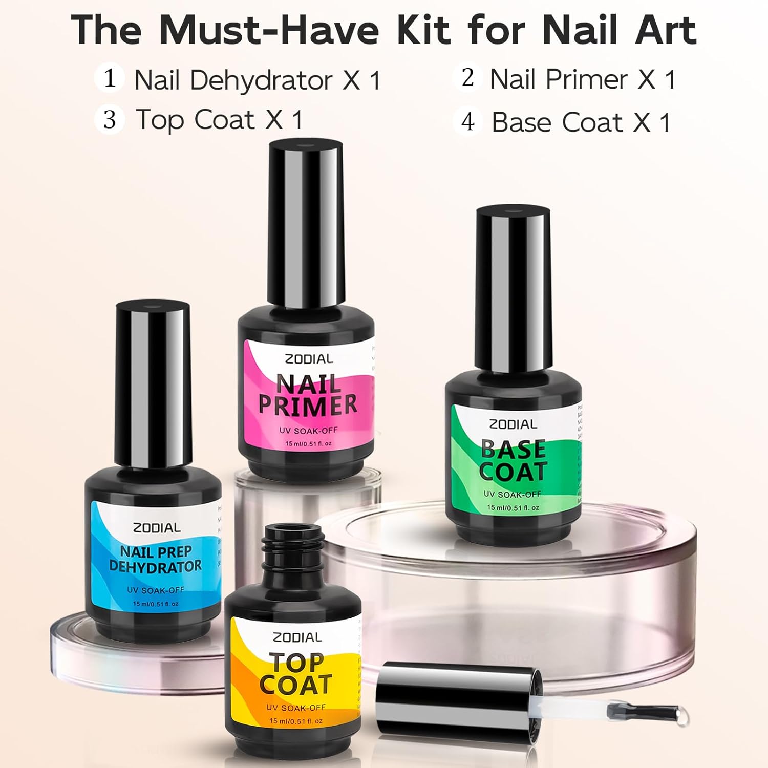 - High-Quality and Protective: ZODIAL Nail Dehydrator and Primer with Glossy No Wipe Top Coat and base, with proper application, can last for 28+ days with a perfect shine. The flexible top coat avoids nicks, chips, or smudges. Ideal Valentine's Day beauty gifts sets for her.You Will Receive: 4 bottles of 15ml gel polish, respectively one bottle of nail prep dehydrator,one bottle of nail primer,one bottle of base coat,one bottle of gloss top coat