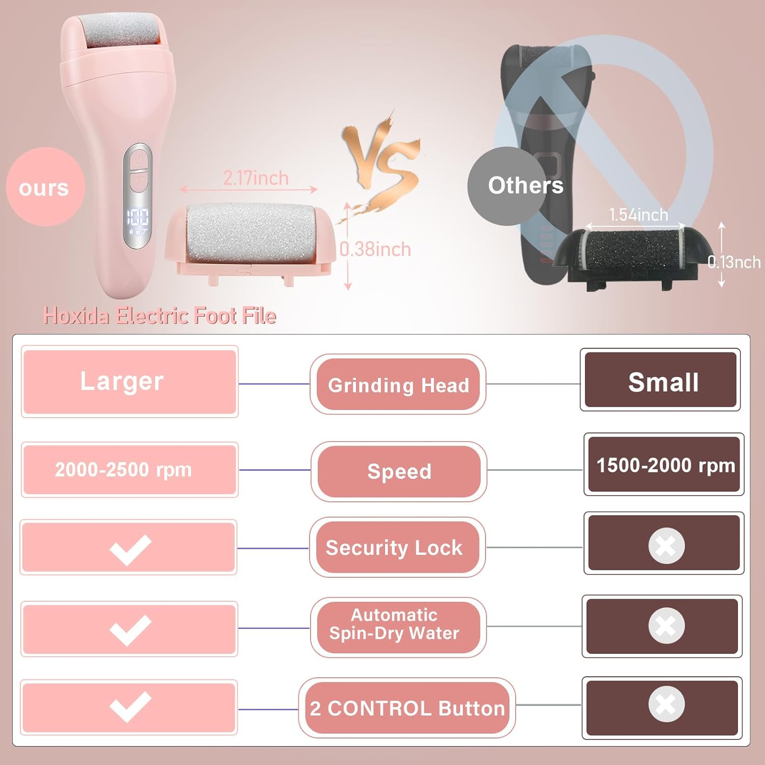 - Electric callus Remover for feet, Powerful & Faster ----- Electric Foot Callus Remover with 2x Strong Motor to buff away hard, dead skin in High Speed, Reveal baby-soft skin in minutes with no prep time. this pedicure tools for feet is with upgrade 2500RPM and 2 Speed- Fast grinding without damage to the healthy skin, best callus remover for feet, Ideal pedicure spa kit gift for men and women.