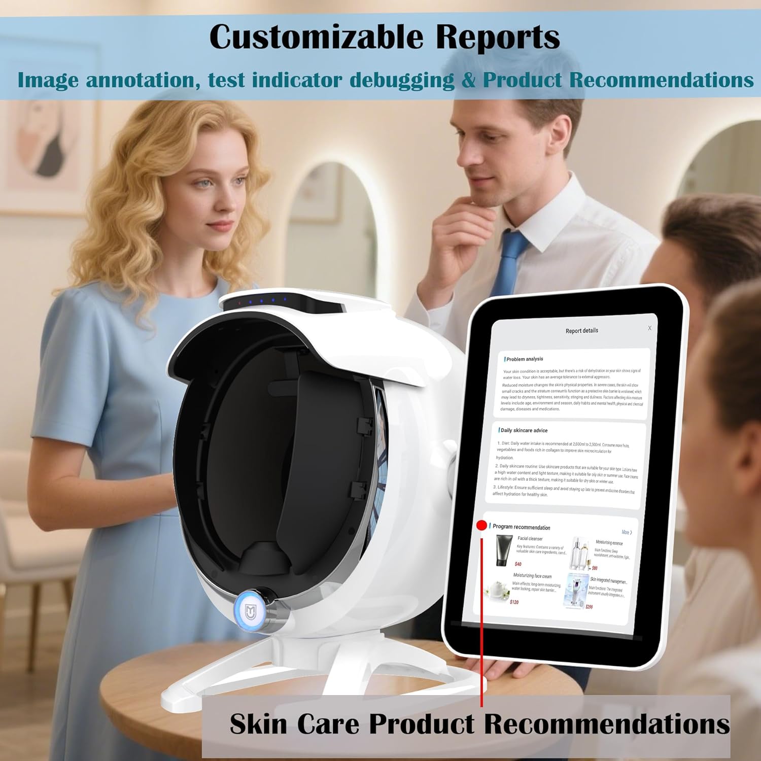 - Advanced 8-Spectral Imaging: Utilizes UV, Wood’s light, polarized light, and more to detect acne, pigmentation, pores, hydration, and sensitivity with accuracy. The system software will provide updates and prompt you for enhancements.
