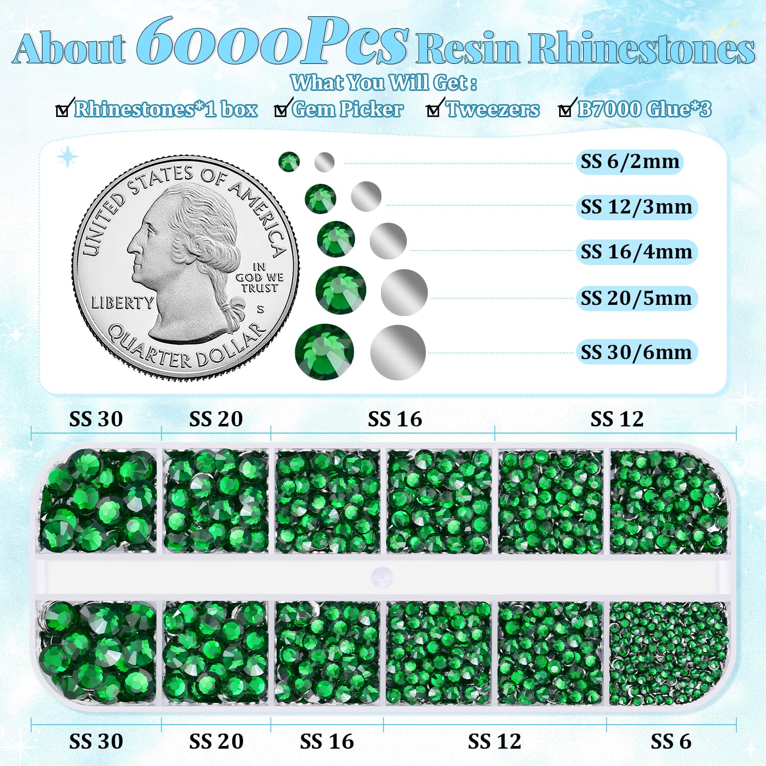 6000Pcs Resin Rhinestones for Bedazzling with 3Pcs B7000 Jewelry Glue, 1 Box Emerald Green Flatback Rhinestones for Crafting Crafts DIY, Crystals Gems for Clothing Shoes Tumblers Nail Art Makeup