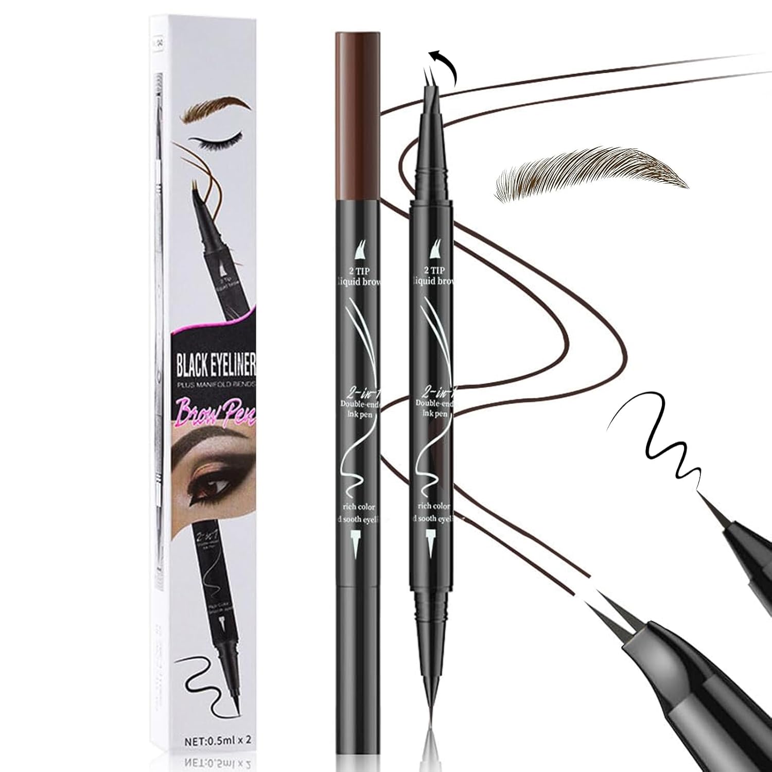 Curved 2 Tip Eyebrow Pen-Brown Eyebrow Pencil With Black Eyeliner 2-in-1 Dual-Ended Create Natural Hair-Like Brows,Waterproof,Smudge Proof,Long Lasting All-Day