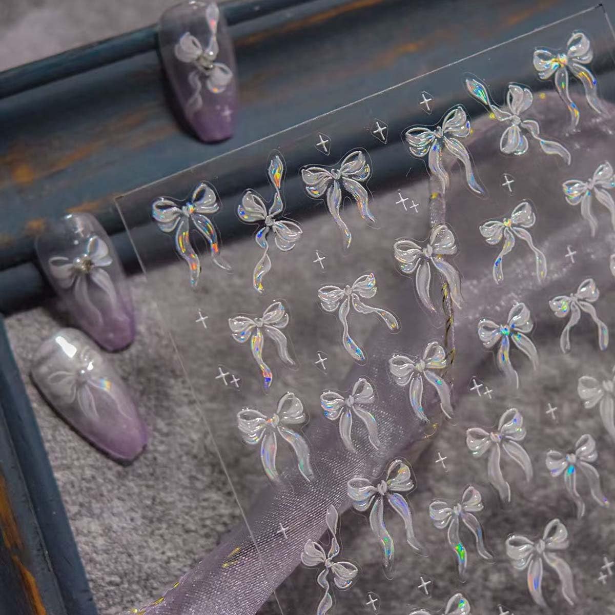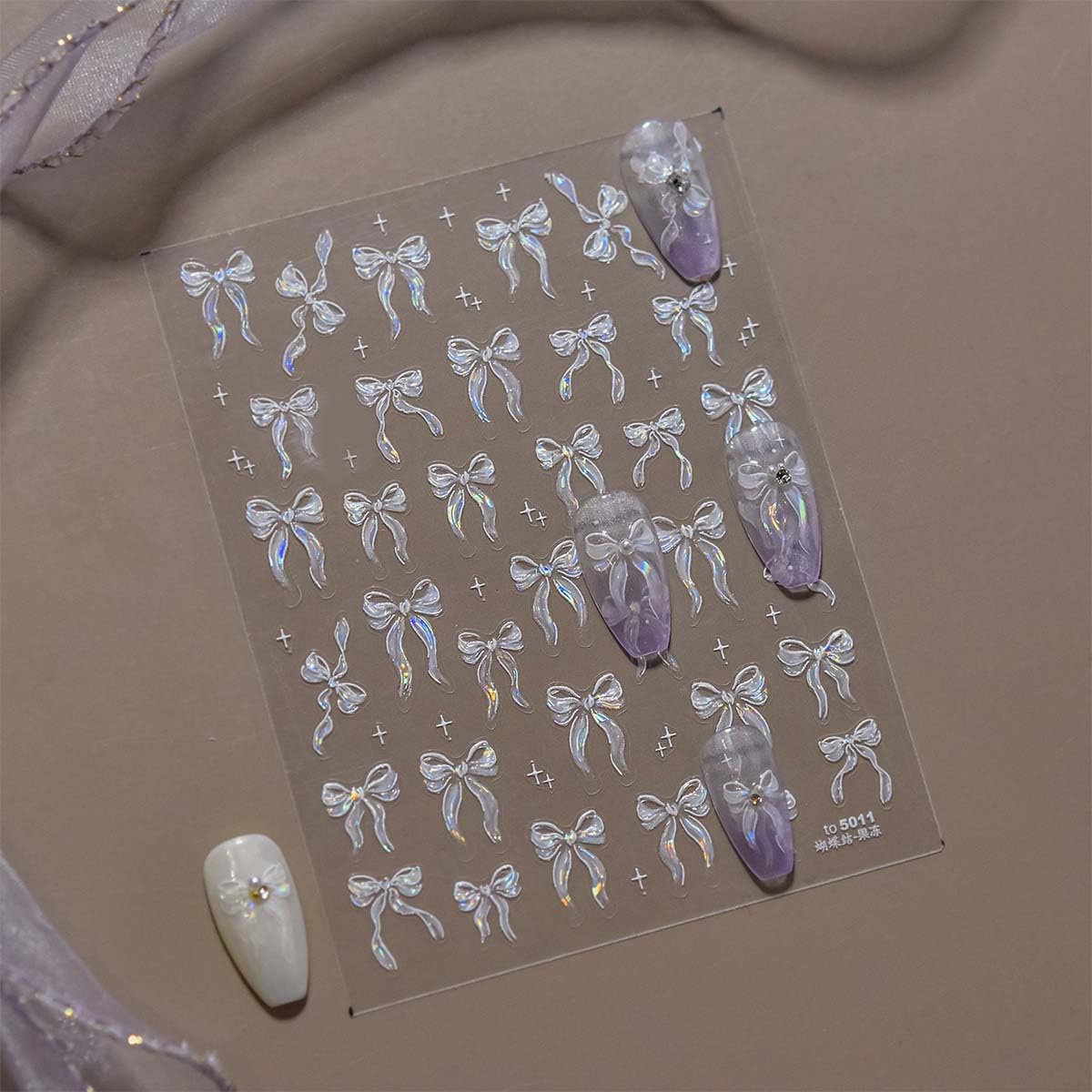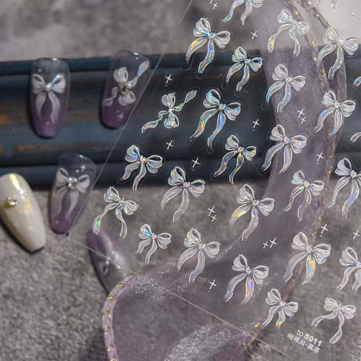 1Sheet Aurora Bow Nail Art Stickers Jelly Bow Nail Decals 5D Embossed White Ribbon Bow Nail Stickers Self-Adhesive Stars Nail Supplies for Women DIY Manicure Decoration