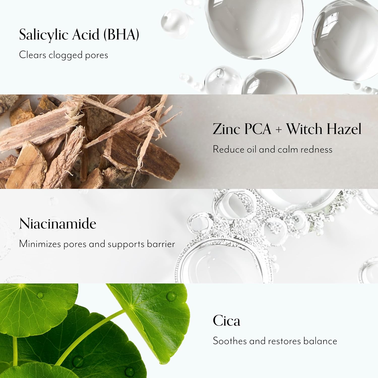 - KEY INGREDIENTS: BHA (SALICYLIC ACID): Helps loosen dirt and excess oil from congested pores while promoting the easy removal of dead skin on the surface. WITCH HAZEL: A natural astringent that helps soothe and tone while decongesting clogged pores. NIACINAMIDE: Helps minimize the look of pores and blemishes while boosting skinโs protective shield. ZINC PCA: Helps to regulate skinโs oil production while calming the appearance of redness. CICA: Known to calm and soothe skin."