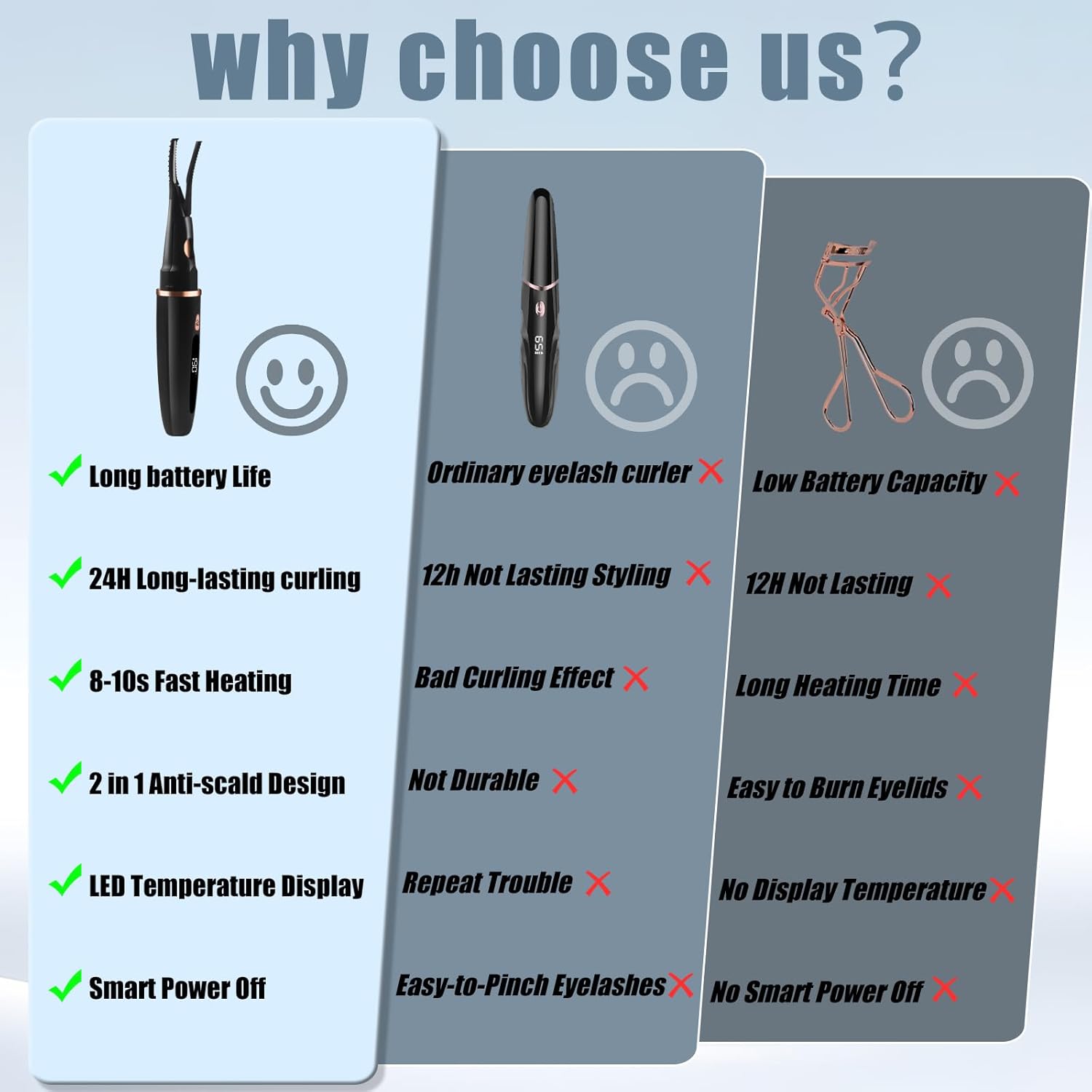 - Adjust Temperature Mode - Our heated eye lash curler comes with 3 temperature settings from 150Β°F to 190Β°F to gently curl your lashes and create stunning curls for amazing curling effect for different types of eyelashes, will not frizzing or pinching them