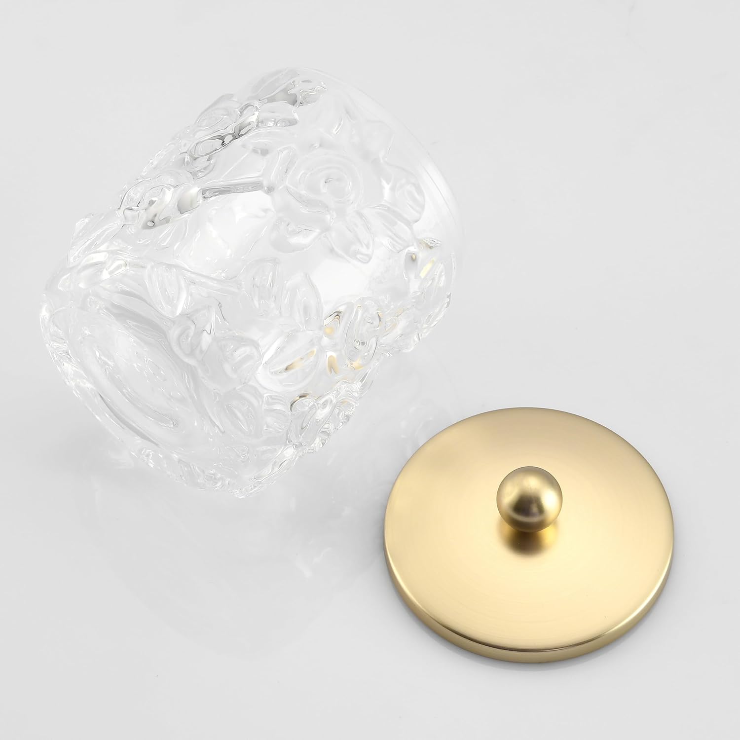Home Glass Cotton Jar Holder Matte Gold Lid, Elegant Bathroom Storage Canister for Qtips, Cotton Balls, Floss, Makeup Organizer, Vanity Bathroom Organization