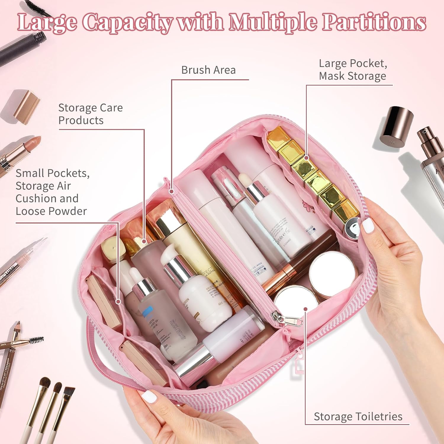 - Quick Access Design - Portable 180ยฐwide-open flat makeup bag with different sized pockets and 2 main compartments, 1 clear pocket for integrated storage of cosmetics, brushes and skin care. No more digging - Effortlessly get all makeup elements right away.