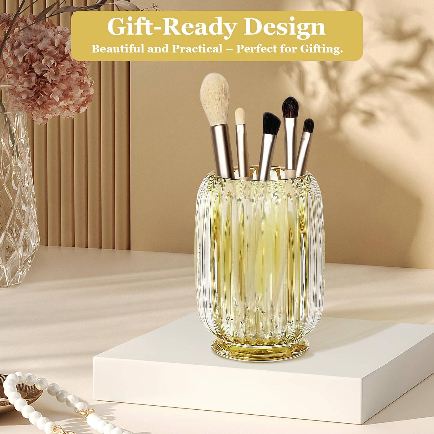 - Premium Thick Glass β Crafted from top-quality thick glass for durability and a luxurious feel, this makeup brush holder keeps its shape and clarity for years of use, while the heavy base prevents tipping