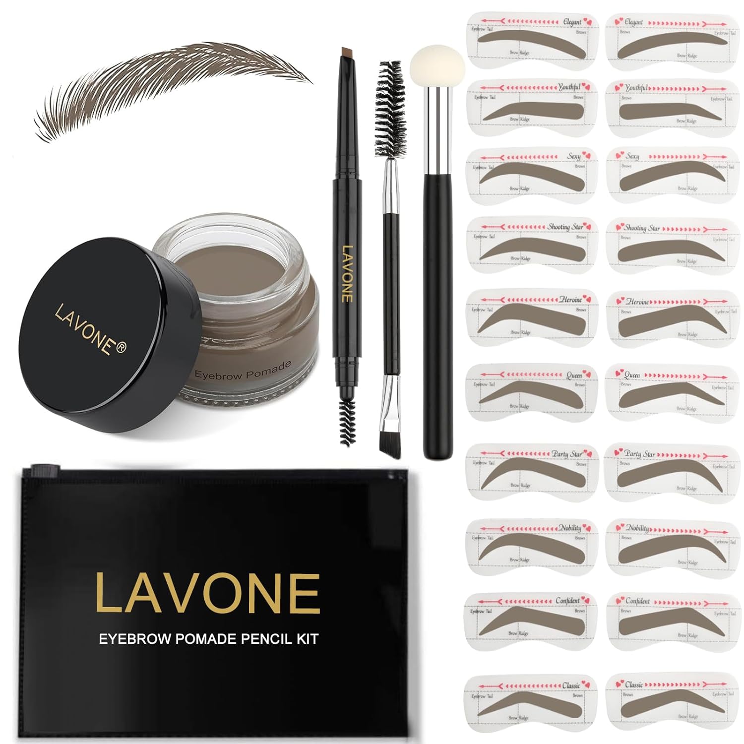 - [Whatโs in the eyebrow kit]: LAVONE makeup eyebrow kit includes eyebrow powder(dark grey), brow pencil (dark brown), 20 eyebrow stencils (10 different shapes), a sponge applicator, a dual precision brush and a zipper pouch for on the go.