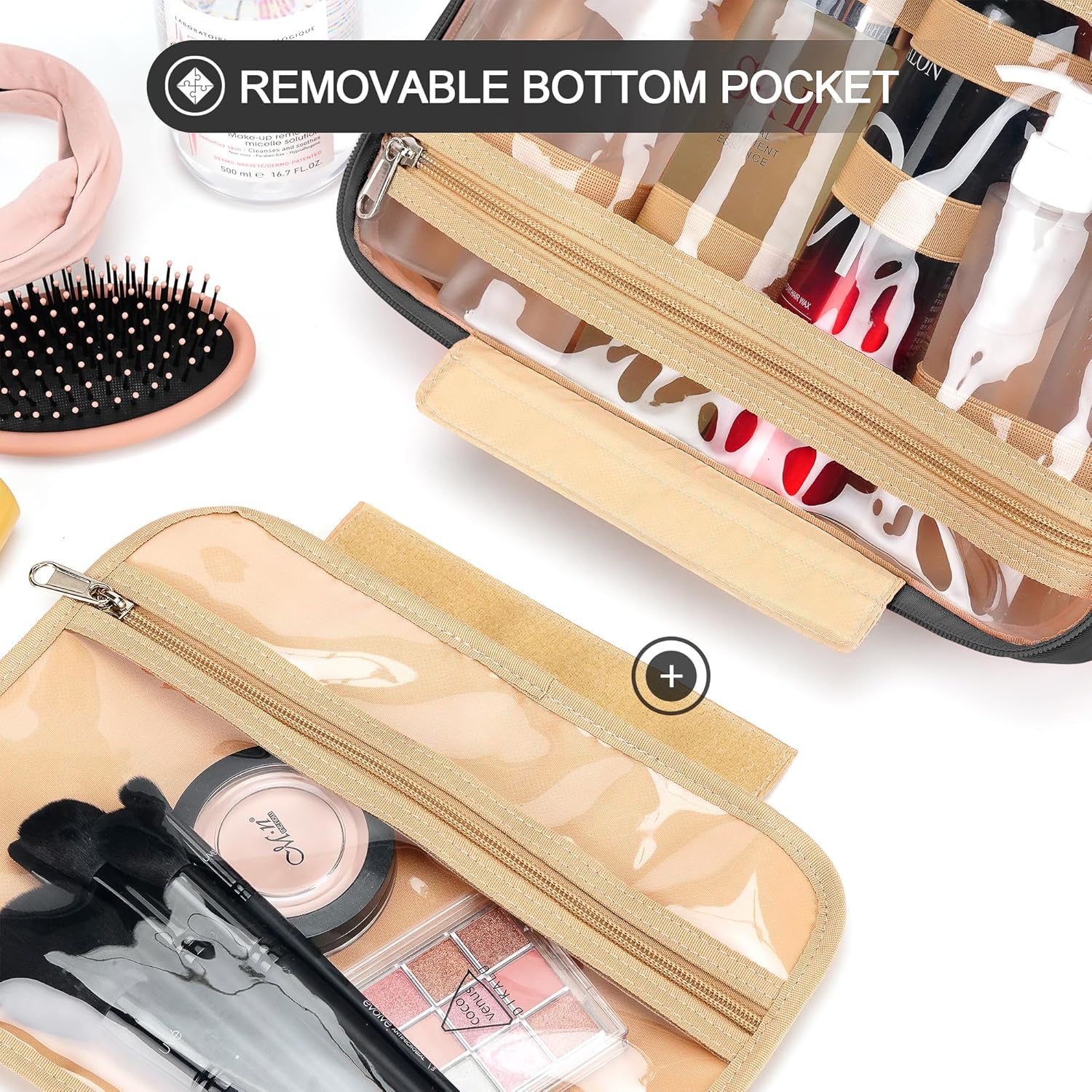 - CONSIDERABLE DESIGN - The elastic bands inside the two main compartments can keep the different height bottles fixed and upright. Your comb, toothbrush, razor, and leak-prone makeup can all go in there, even a hair dryer. 360ยฐ metal hook gives you a variety of hanging options.